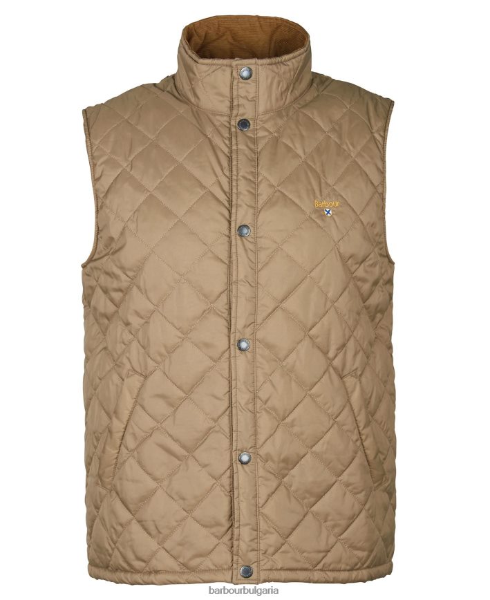 жилетката с емблема на Barbour се отличава с дизайн на юрган тип кутия със стойка яка и предно закопчаване с шипове, показващи два долни джоба с ленти и вътрешен джоб с кръпка, завършен с брандиране вляво на гърдите.