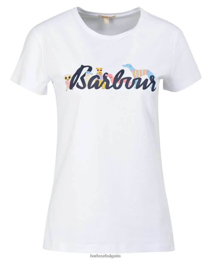 от мека и удобна смес от памук, тази тениска е страхотна за носене през целия ден. дрехата с къс ръкав се отличава с кръгло деколте с голям надпис barbour и многоцветни щампи на кучета на гърдите - идеално за добавяне на забавен привкус към външния вид.